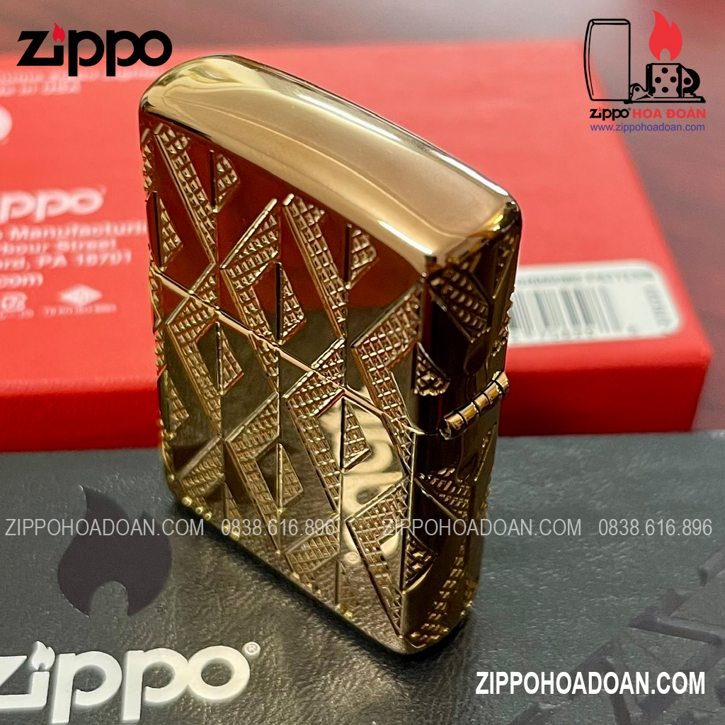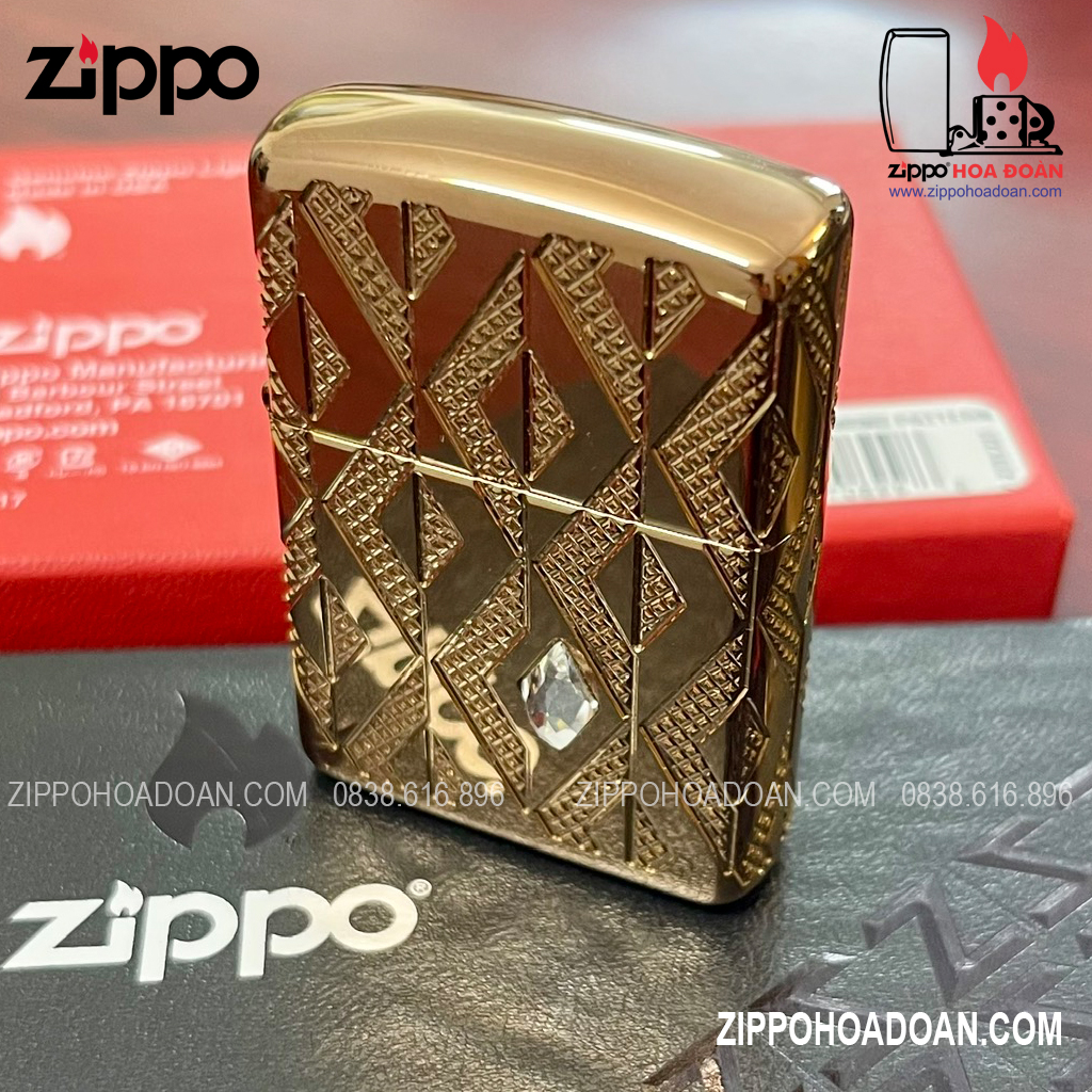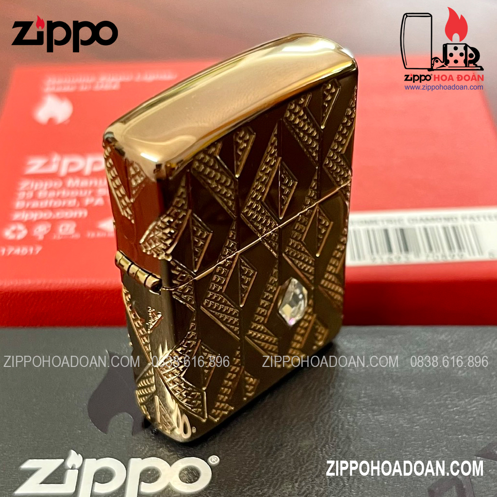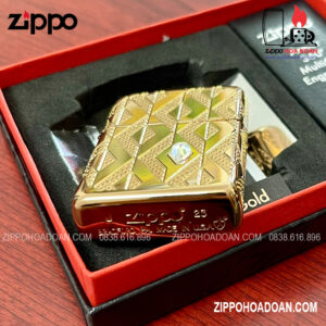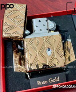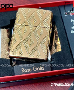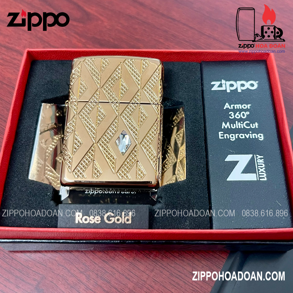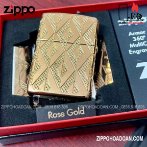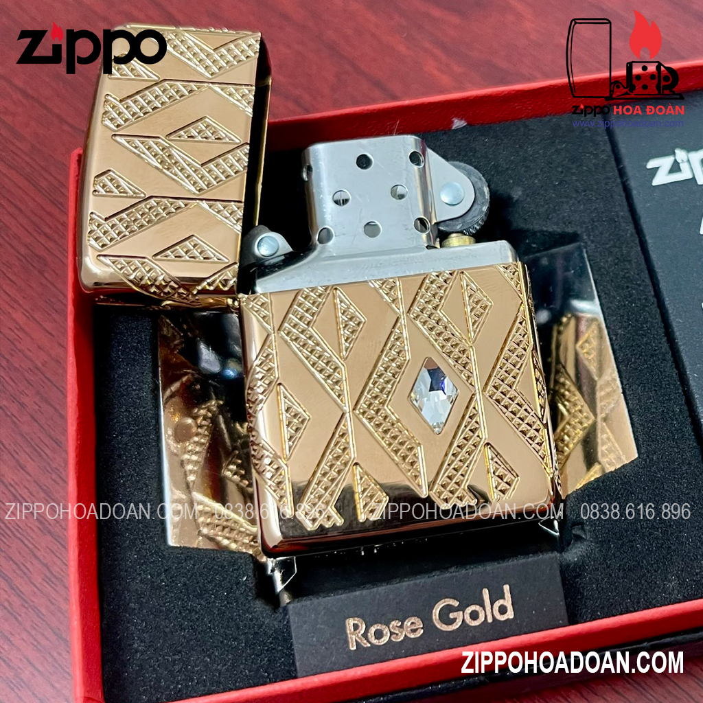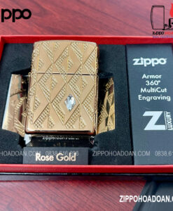 Thiết kế này có các họa tiết hình kim cương được khắc sâu đa chiều MultiCut được bao bọc xung quanh chiếc Zippo vỏ dày vàng hồng Armor® Rose Gold, đính kèm một viên pha lê hình kim cương ở mặt trước, tạo điểm nhấn vô cùng sang trọng và nổi bật cho chiếc bật lửa.